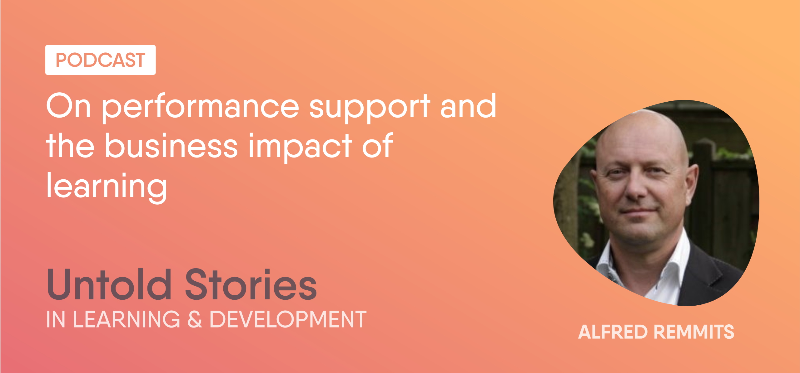 Kasper: Today my guest is Alfred Remmits. The podcast is about giving a voice to people that we don’t hear all that often. So, I think that the whole space of Learning & Development is sort of dominated by a few thought leaders who are all over the place writing, speaking, presenting. And what we want to do is talk to a lot of people will have different directions and different backgrounds in Learning & Development. So last week, we had Louise Puddifoot who is working in L&D for a long time first as a bit in corporate and then with her own company. Alfred is more on the other side of things, on the vendor side of things, so expect an interesting conversation. So, Alfred, can you give a short introduction of yourself maybe?