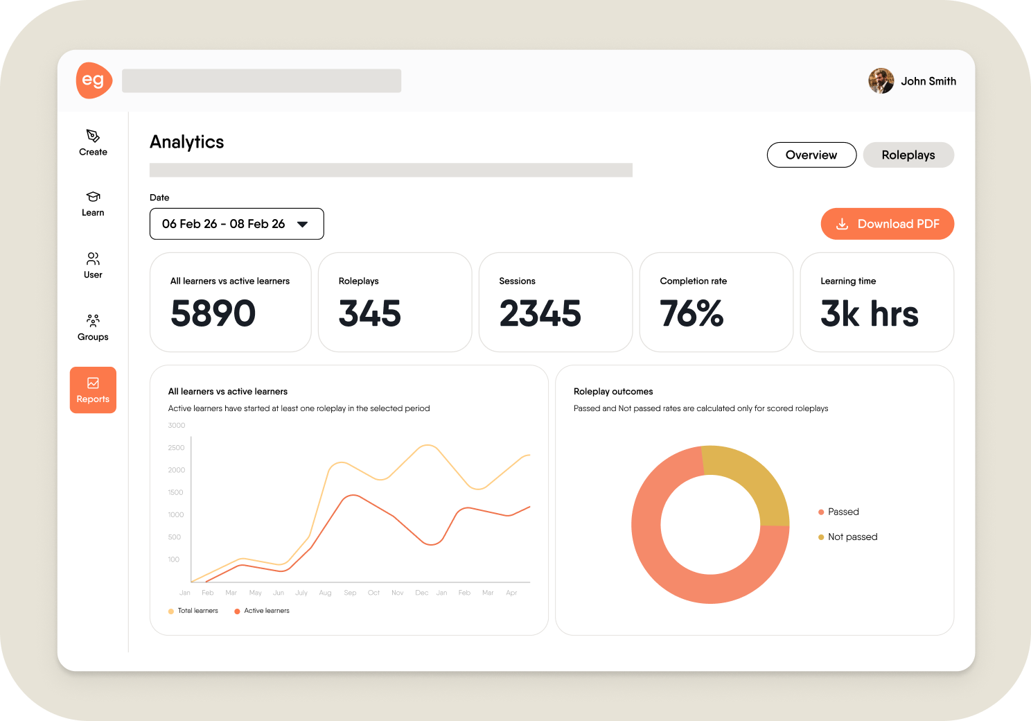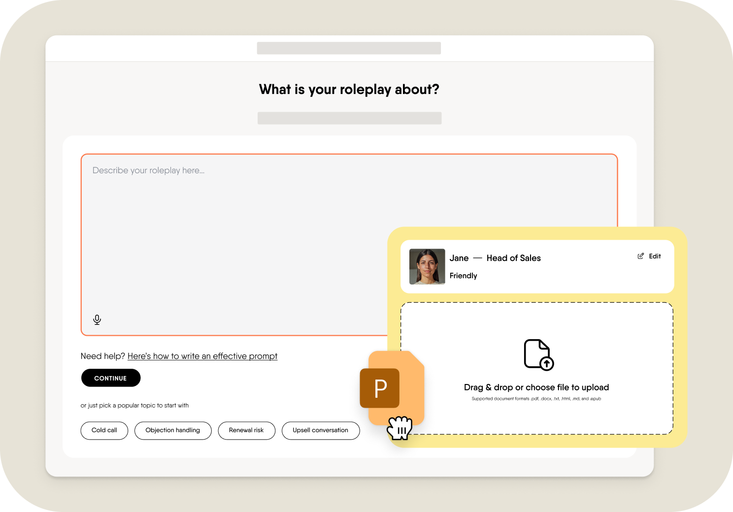 L&D teams, managers, or learners can create scenarios. Add your outline, upload company documents to tailor it to your context, and set your evaluation criteria. AI turns it into a roleplay.