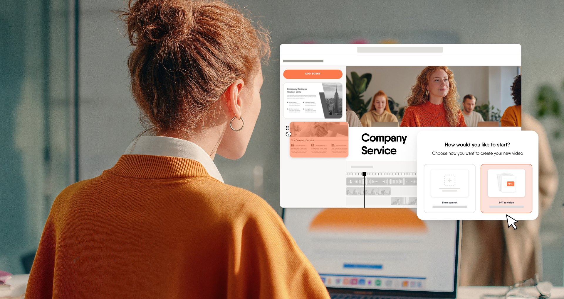 Build videos scene by scene, and choose from 155+ avatars, voiceovers, and stock media.