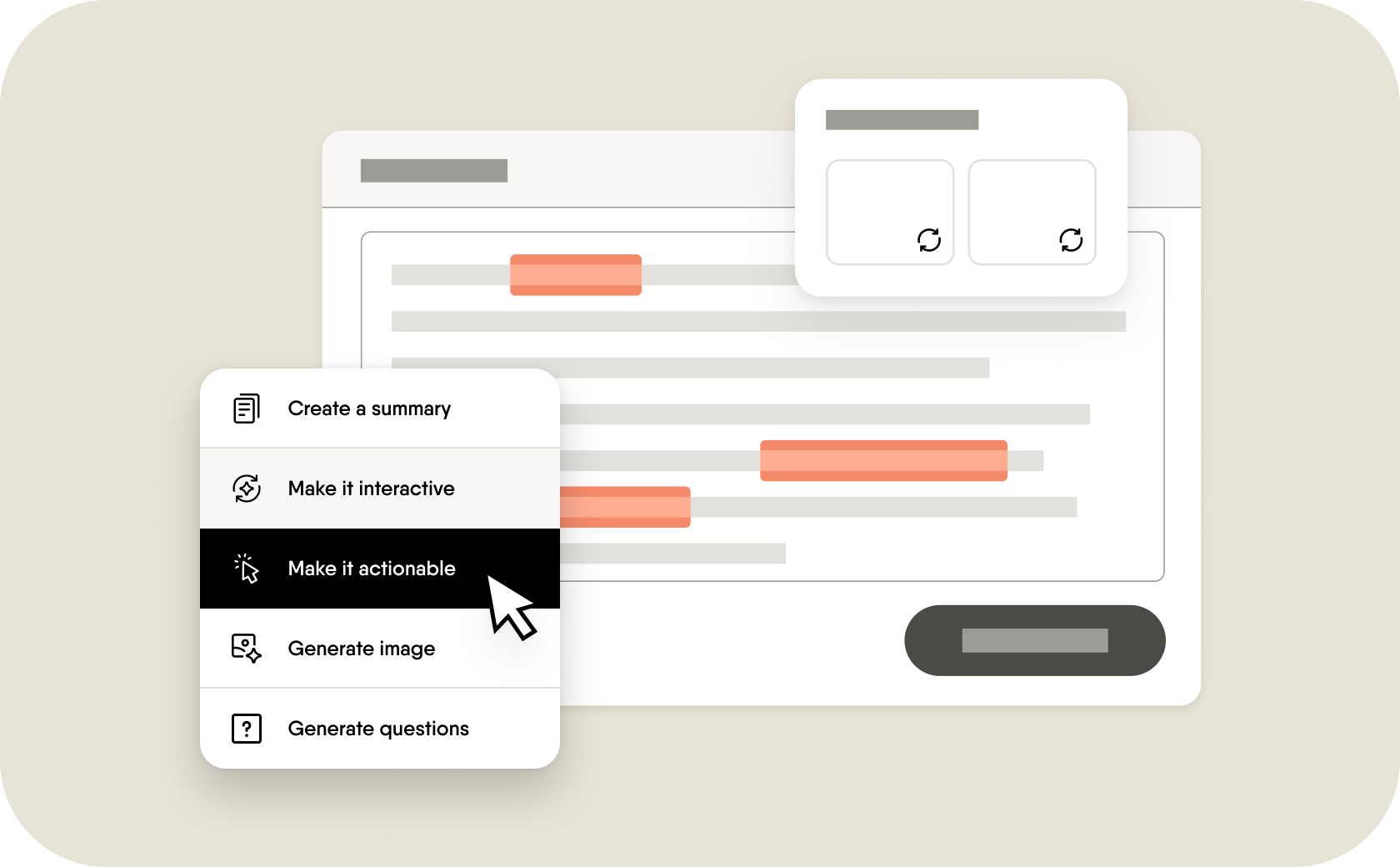 Generate a full draft in minutes — complete with images, questions, and flip cards. Add company context to the Knowledge Base for more refined, on-brand AI content in every block.