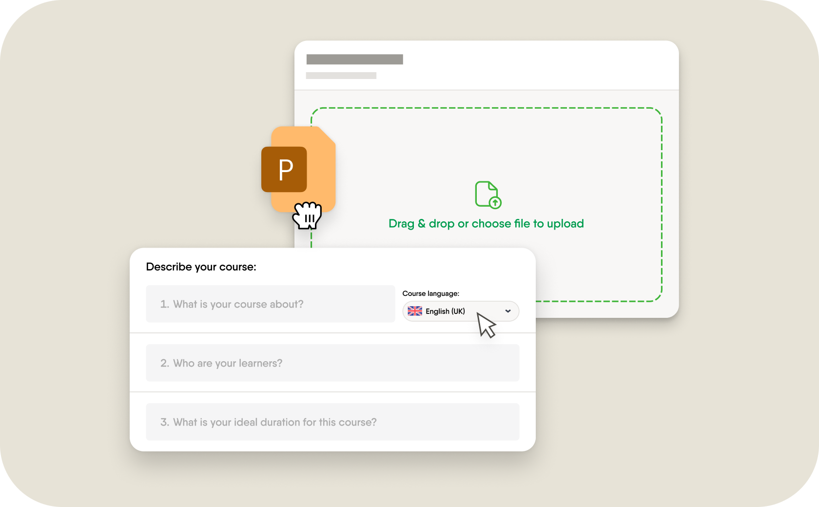 PowerPoints and PDFs collecting dust? Not anymore. Upload them and turn documents into actionable courses in minutes— keep the structure intact or enhance it with AI.