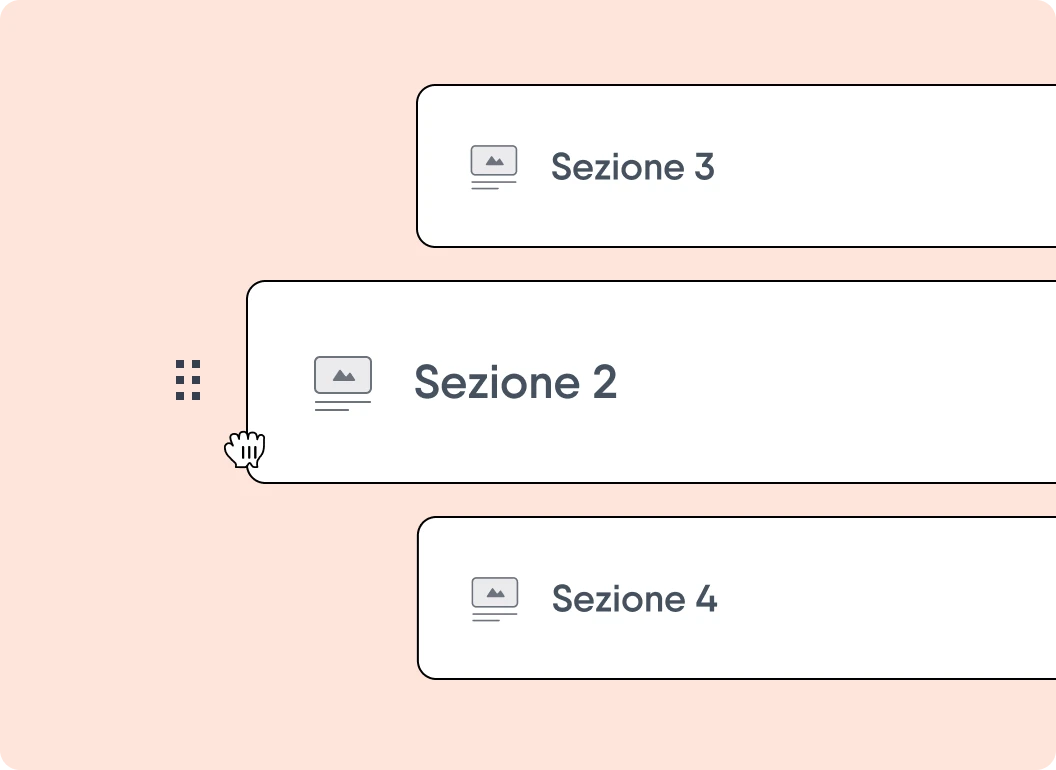 L’editor drag-and-drop è davvero intuitivo. Vuoi aggiungere una pagina, un video o un quiz al tuo corso? Tutto quello che devi fare è trascinare gli elementi che vuoi inserire nel corso per renderlo ancora più efficace.